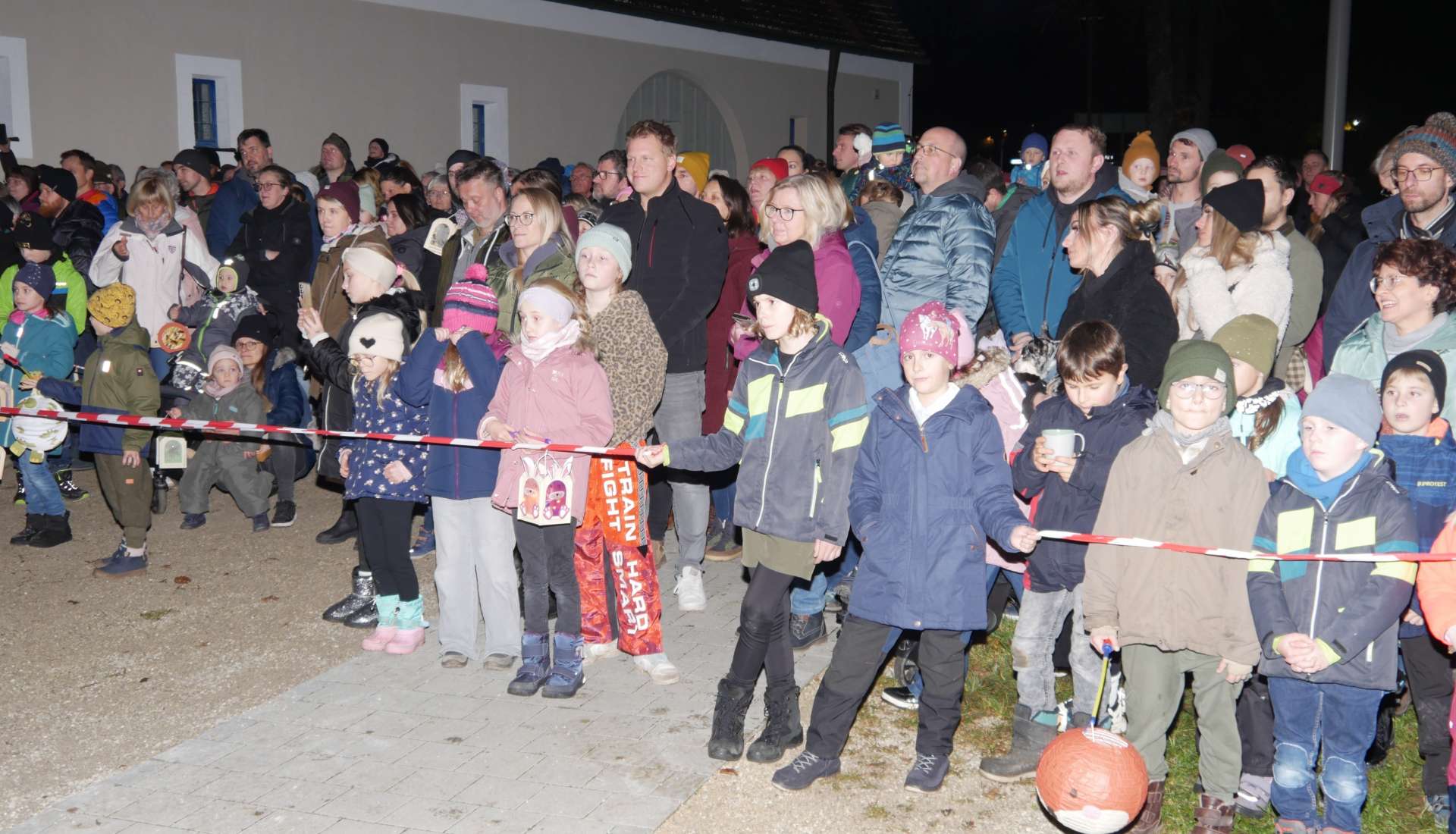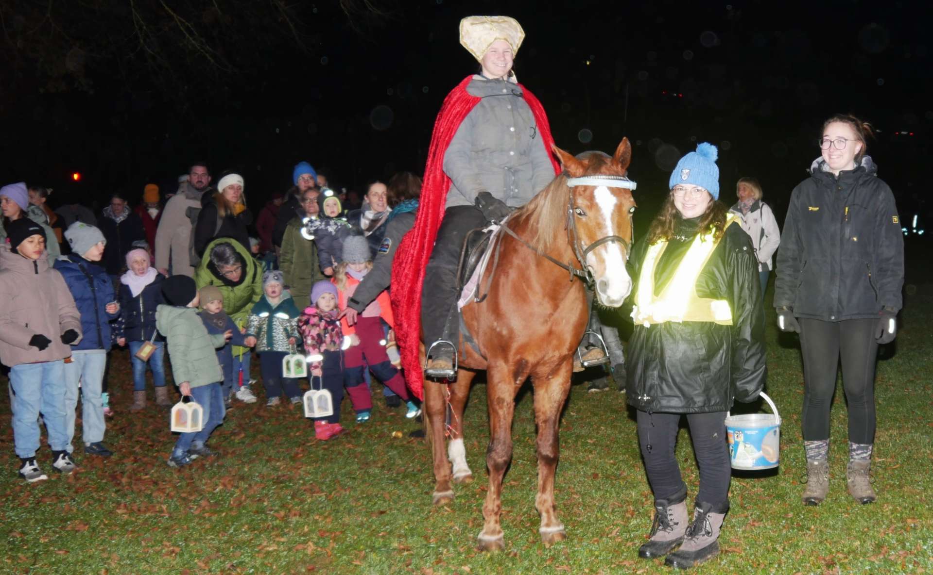 Sankt Martin, hoch zu Ross, (in Person von Klara Riederer von Paar) ritt, mit dem Pferd, geführt von Besitzerin Andrea Meier, an der Spitze des Laternenumzugs, der rund um den Schulsportplatz führte.