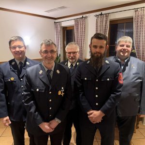 Bild von links: Vorsitzender Benjamin Hiltl, 1. Kommandant Klaus Kölbel, KBI Hans Sperber, der neu gewählte 2. Kommandant Lukas Maul und Bürgermeister Dieter Dehling